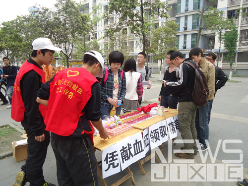 穿着红马甲的机械青协志愿者们在二食堂门口旁摆起桌子,并在桌子上放好了精美的小礼品。在本次活动中,曾义务献血的同学可携带自己的献血证免费领取小礼物,包括指甲刀、扑克牌等。并可以抽奖一次,有可能获得保温杯或“战斗鸡”等礼品。活动一开始就吸引了许多来往的同学,同学们对凭献血证领奖品表现出了极大地兴趣。